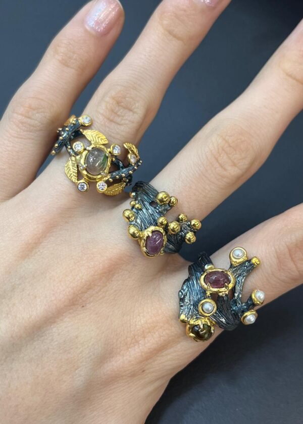 Özel Tasarım Gerçek Doğal Taş Detaylı Altın Kaplama Gümüş Yüzük