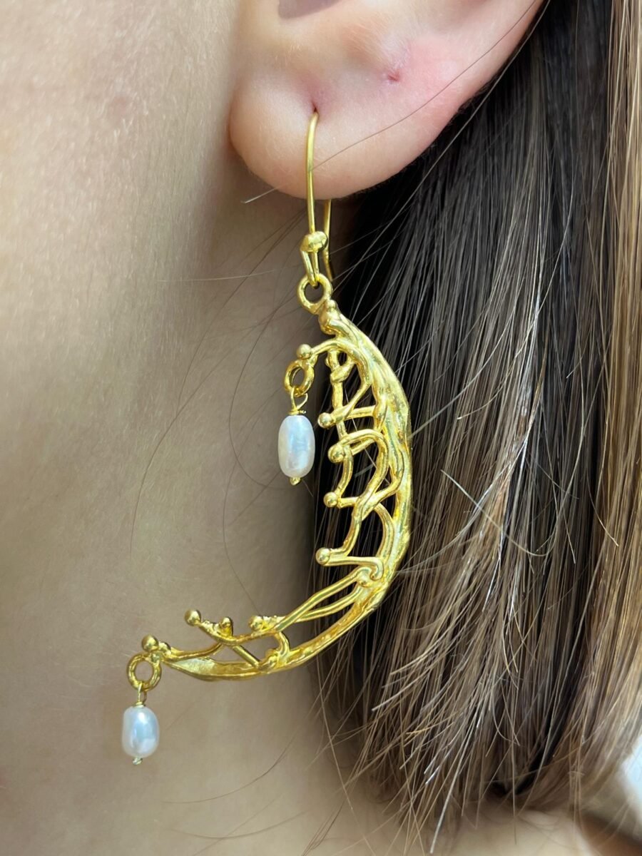 İnci Detaylı Ay Sembollü Altın Kaplama Gümüş Sallantılı Küpe