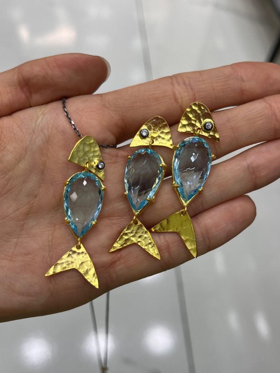 Özel Tasarım Doğal Taşlı Balık Sembolü Altın Kaplama Gümüş Kolye Ucu